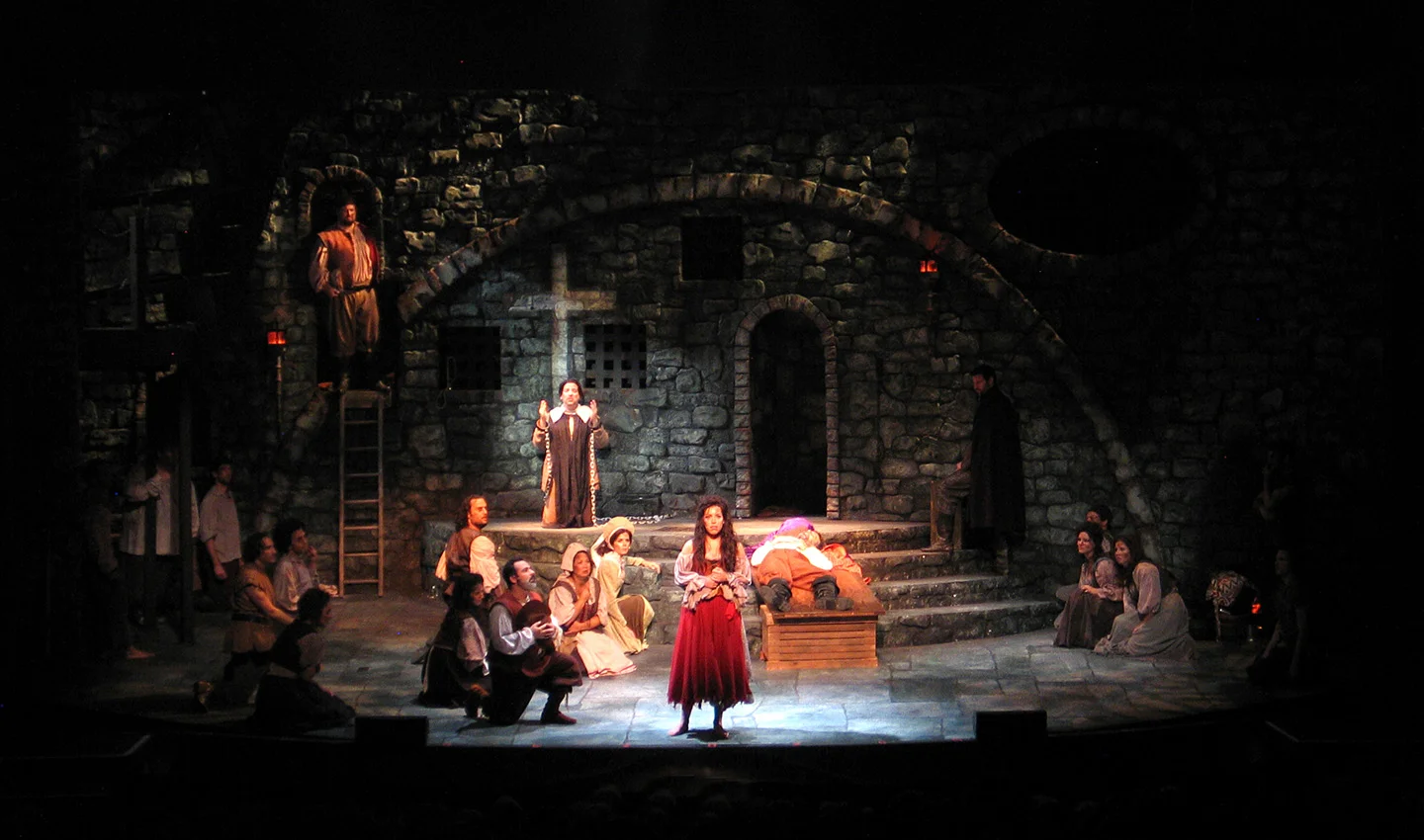 “Even though the action takes place in a dungeon and the cast members, including the title character, are supposed to be outcasts, La Mancha has the lushest-looking set MGR has had all summer…There are forbidding stone walls, menacing shackles, gleaming soldiers’ helmets, fetid beggars and gypsies, and the drawbridge to hell, or at least the Spanish Inquisition.”
