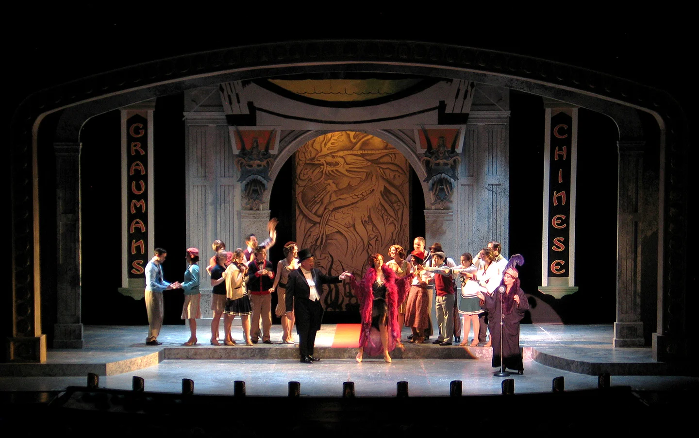 “Scenic designer Czerton Lim has come up with an elegant modular set that is able to encompass several Tinseltown locations, particularly a very effective and fun version of Graumann’s Chinese Theatre, a lovely park setting, and various soundstages.”
