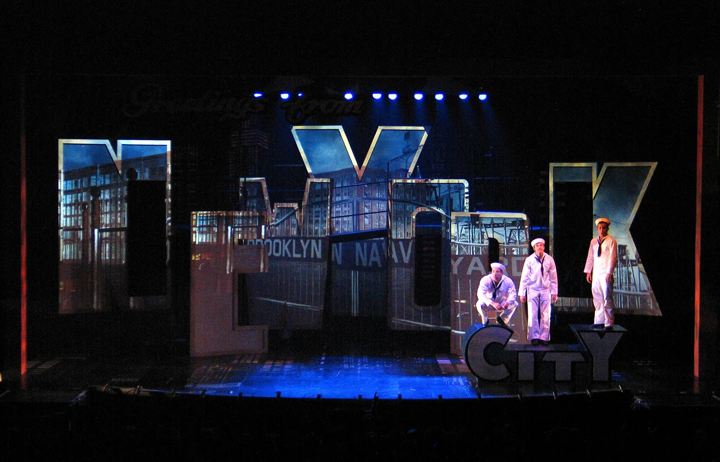 "There’s a charming innocence to three gobs seeking adventure and romance in this magical town—and Czerton Lim’s stunning set, brilliantly lit by Dan Ozminkowski, captures it all. A weathered American flag becomes the framework for the set pieces: huge letters spelling out New York in an old postcard font, with a Manhattan skyline silhouetted beyond. The set is, in fact, a 1940s postcard come to life, as video projections (by Brad Peterson) on the letters swiftly take us from one locale to another—the Brooklyn Navy Yard, Coney Island, a string of nightclubs. The effect is lively and dazzling, and adds emotional tones—the endless loneliness of the subway tunnels; warplanes in formation soaring in a pale sky."