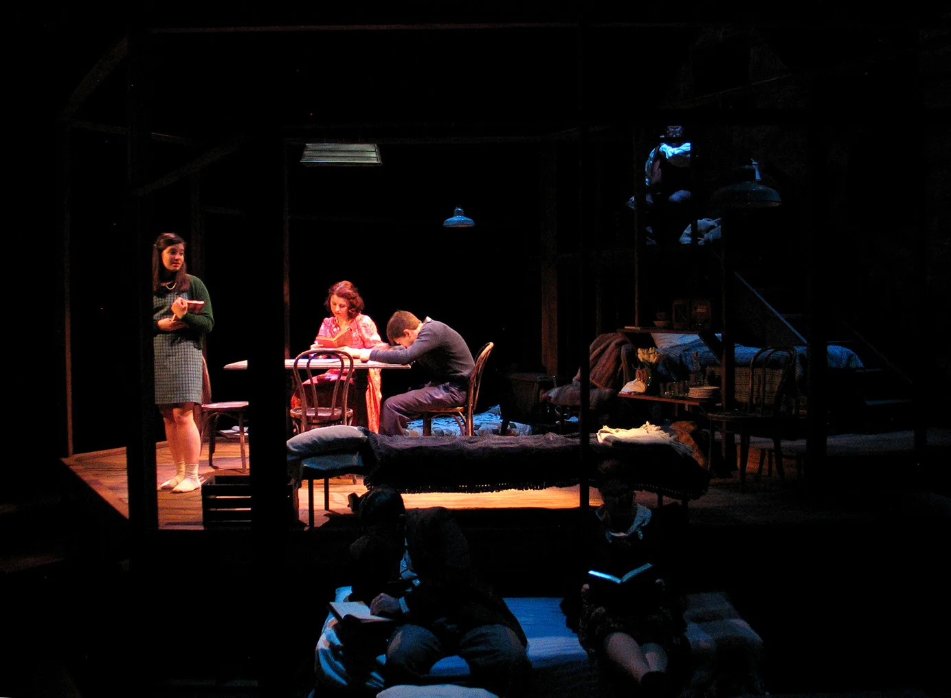 "Czerton Lim’s scenic design is also just as much a character in this show and one that helps to capture the overall theme. It is a four-level set, framed in by wall corners. There are stairs in different spots throughout and it faithfully reproduces the cramped feel of so many people living in such a small space for more than two years. "