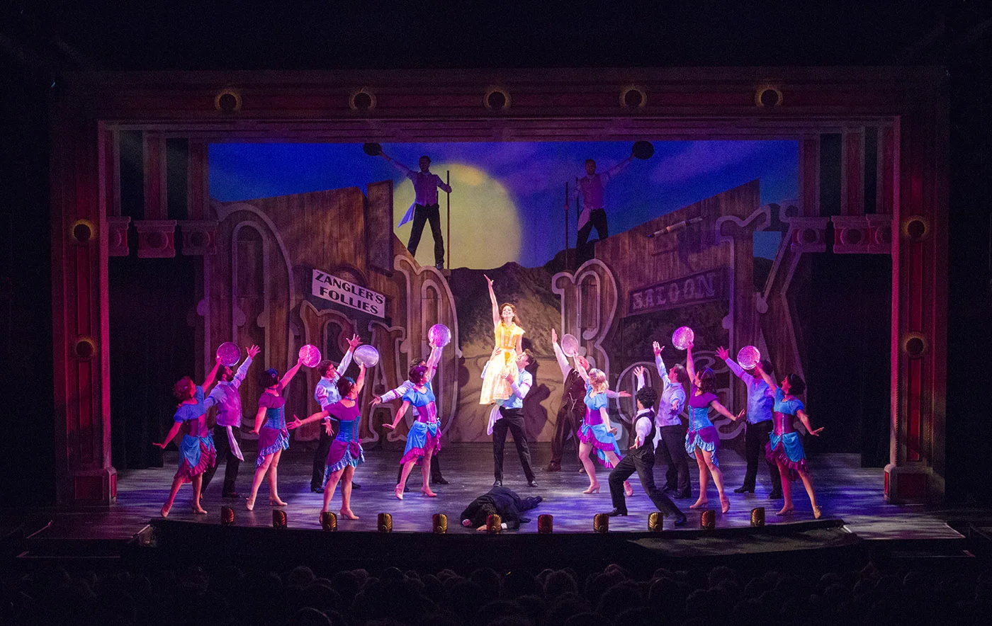 "We switch between 1930s New York City—where Bobby Childs, yearning to dance, tries to avoid the family banking business—and Deadrock, Nevada, where Polly Baker, postmistress, is the only woman in a dying town. Completed by Dan Ozminkowski’s lighting, Czerton Lim’s crafty, cartoonish backdrops set the stage perfectly. Out West, there’s another comic wink, where the facing buildings—the former theater turned post office and the local saloon—actually spell out “Dead” “Rock.”