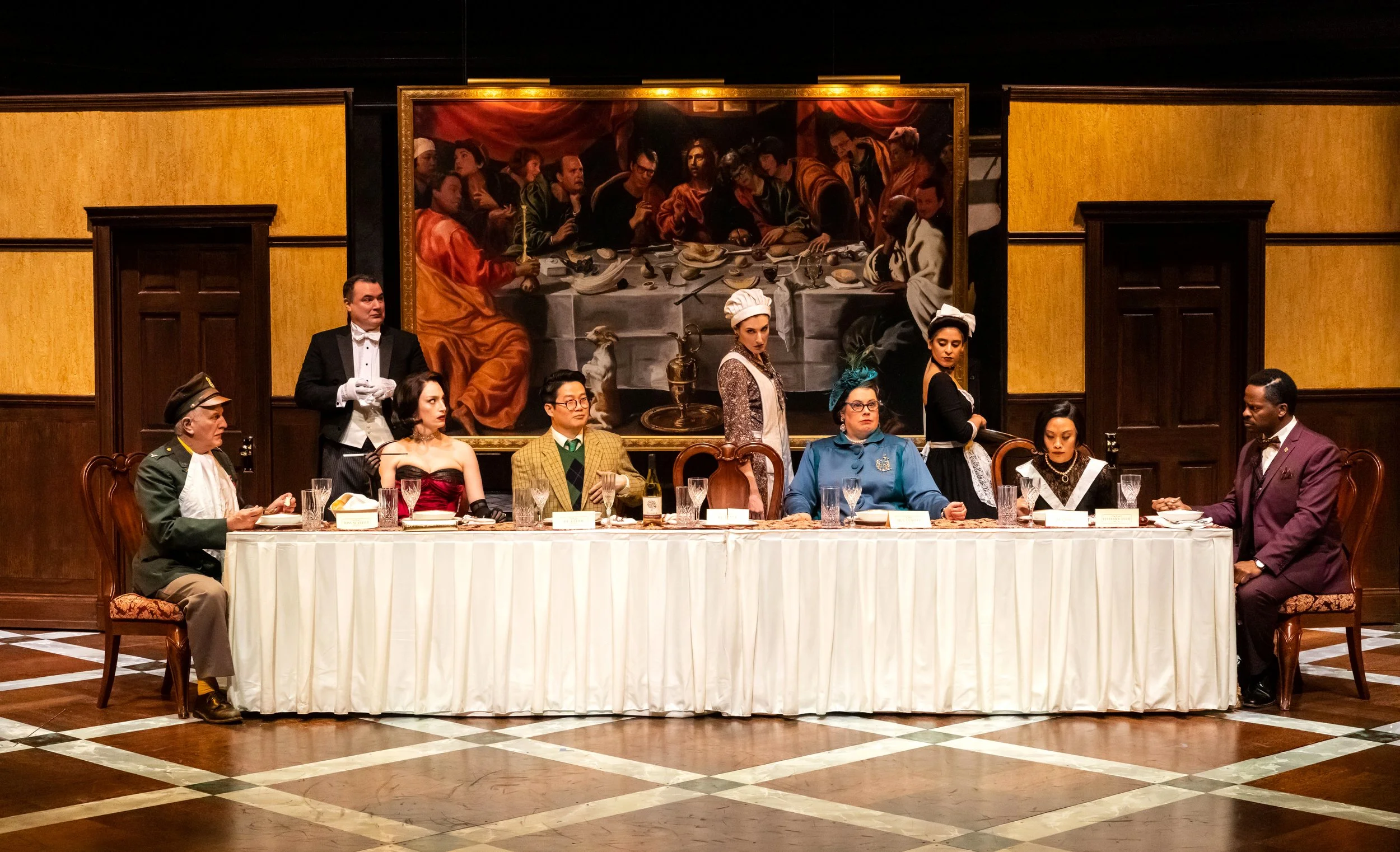 “The set, visible to the audience as they take their seats, is delightful. The manor house onstage with its leaded windows, inlaid floors, and dour portrait of an unnamed forebear feels immersive…Speaking of Tim Curry, the set design by Czerton Lim nods to the iconic actor with a massive portrait of that aforementioned Boddy forebear that bears a striking resemblance to Curry: I didn’t notice (not having seen the film), but my sharp-eyed theater companion remarked on it.”